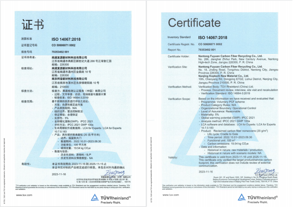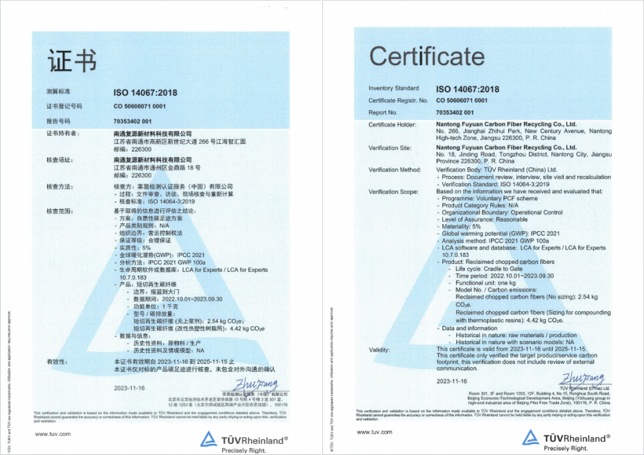 喜訊!2023年11月16日,南通復源新材料科技有限公司(以下簡稱 “南通復源”)的短切再生碳纖維(無上漿劑)、短切再生碳纖維 (改性熱塑性樹脂用)、再生碳纖維表面氈等三款產(chǎn)品,獲得由萊茵技術監(jiān)督服務(廣東)有限公司(以下簡稱 “TüV”)頒發(fā)的ISO 14067產(chǎn)品碳足跡核查聲明證書。這些證書不僅為后續(xù)南通復源的再生碳纖維產(chǎn)品做了科學權威認證,更是幫助下游企業(yè)走向世界的一份“綠色通行證”。